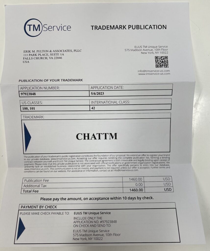 The scam is for a bogus publication that is worthless. And the cost for this “TM Service” from “EUUS TM Unique Service” is listed as 1460.00 US per year!