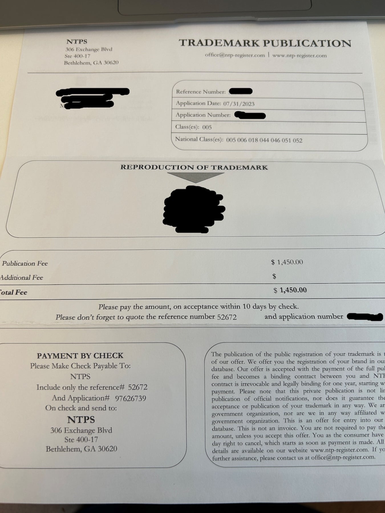 This looks essentially identical to past scams, but with a new “name” from NTPS or ntp-register.com and a new address at 306 Exchange Blvd, Ste 400-17, Bethlehem, GA 30620. The offer asks for $1,450. The address appears to be a UPS Store.