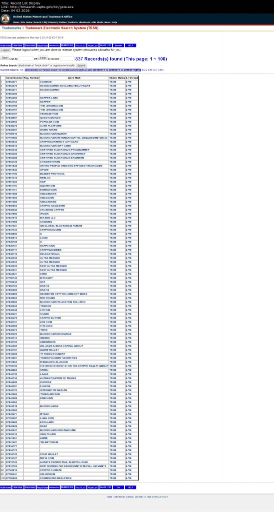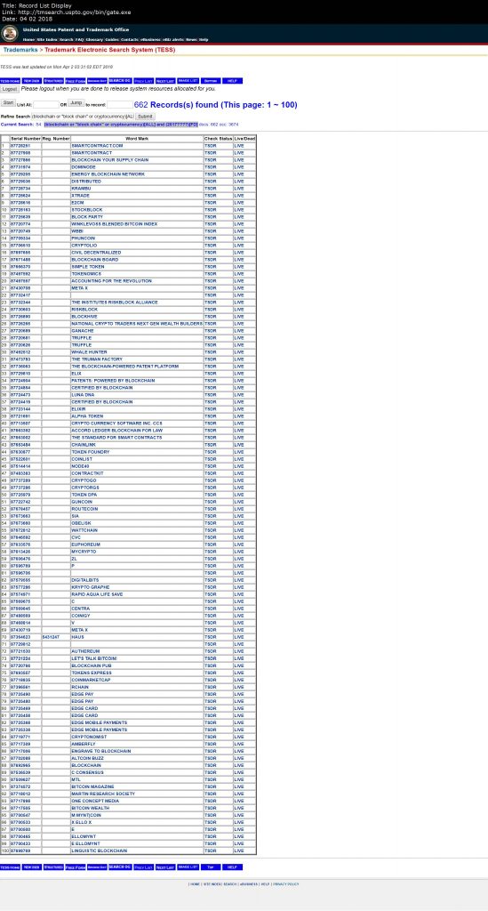 In 2017, the total number of USPTO trademark applications that featured blockchain or “block chain” or cryptocurrency somewhere in the filing was 662.