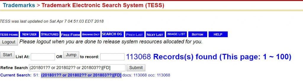 - Note: 2018 data retrieved via TESS search on USPTO.gov on April 7, 2018
